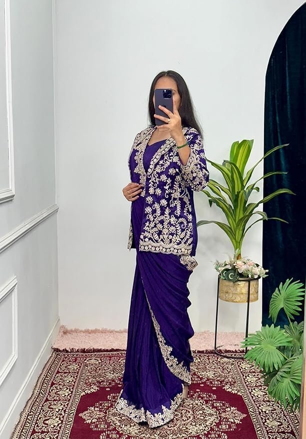 Ready To Wear Saree & Koti Set For Women Bollywood Style Chinon Silk Fabric On Embrodery Sequance Cording Work